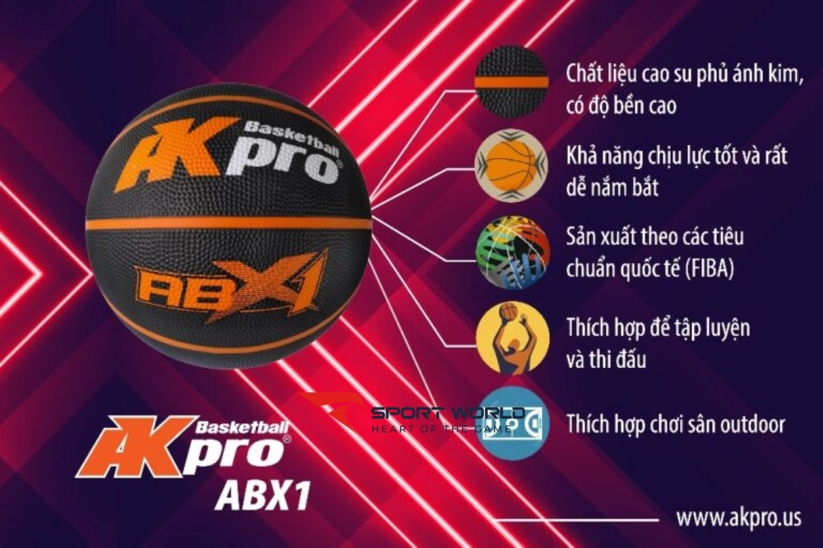 - Bóng rổ AKpro ABX1 được làm từ chất liệu cao su dai bền, có độ nảy ổn định, bóng êm, hướng bay chuẩn, khả năng chống thấm nước tốt, ít bị mài mòn. Bóng có cấu tạo nhiều lớp nên không bị biến dạng qua quá trình sử dụng và có độ bền cao. Phần ruột bóng Butyl được làm từ chất liệu bền, cho khả năng giữ hơi cực tốt.