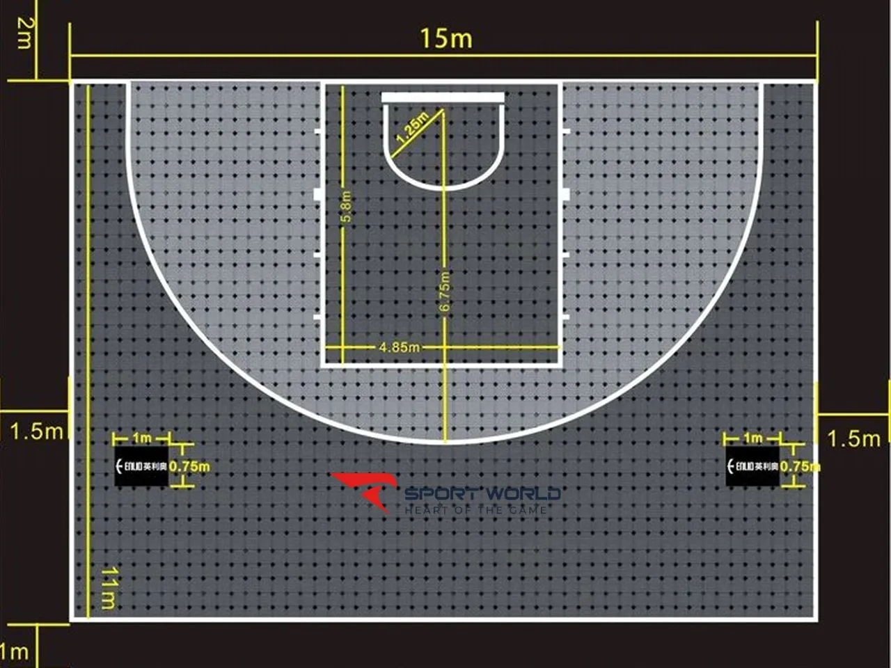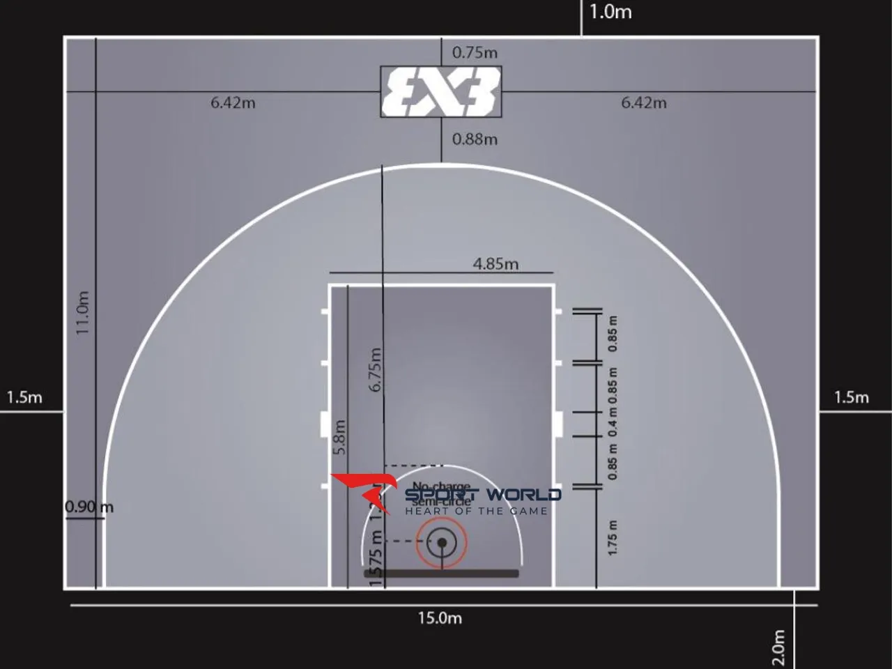 Như vậy, một sân bóng rổ 3x3 đạt chuẩn không chỉ đảm bảo diện tích 15 × 11 m mà còn cần thêm phần diện tích phụ xung quanh để phục vụ cho an toàn, quản lý và tổ chức thi đấu.