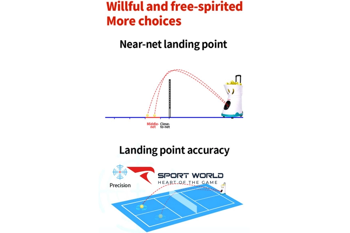 - Điểm rơi gần lưới: Với tính năng điều chỉnh điểm rơi chính xác, máy đảm bảo rằng các bóng được phát ra gần lưới, giúp người chơi luyện tập các kỹ thuật phản xạ và điều chỉnh vị trí chuẩn xác hơn.