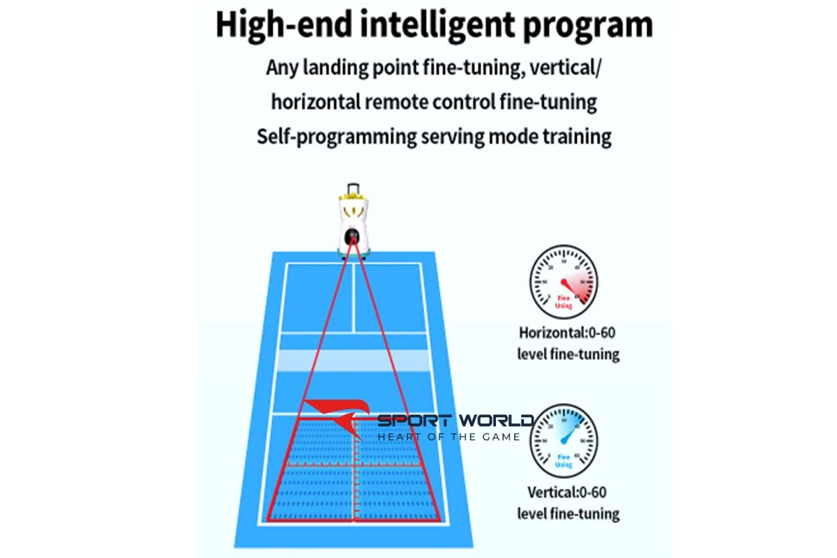 - Khả năng điều chỉnh điểm rơi thông minh: Với khả năng điều chỉnh điểm rơi gần thực tế, máy cho phép người dùng chọn lựa nhiều tùy chọn hơn để phù hợp với nhu cầu tập luyện cá nhân. Chương trình thông minh cao cấp giúp tinh chỉnh điểm rơi với độ chính xác cao, cho phép điều chỉnh dọc và ngang từ xa. Điều này đảm bảo rằng mỗi cú giao bóng đều đạt được độ chính xác mong muốn, giúp người chơi luyện tập trong các tình huống gần giống như trong trận đấu thực tế. Tính năng tự lập trình chế độ phục vụ cho phép người dùng thiết lập các chương trình tập luyện cá nhân hóa, từ đó nâng cao hiệu quả luyện tập và đáp ứng nhu cầu đa dạng của từng người chơi.