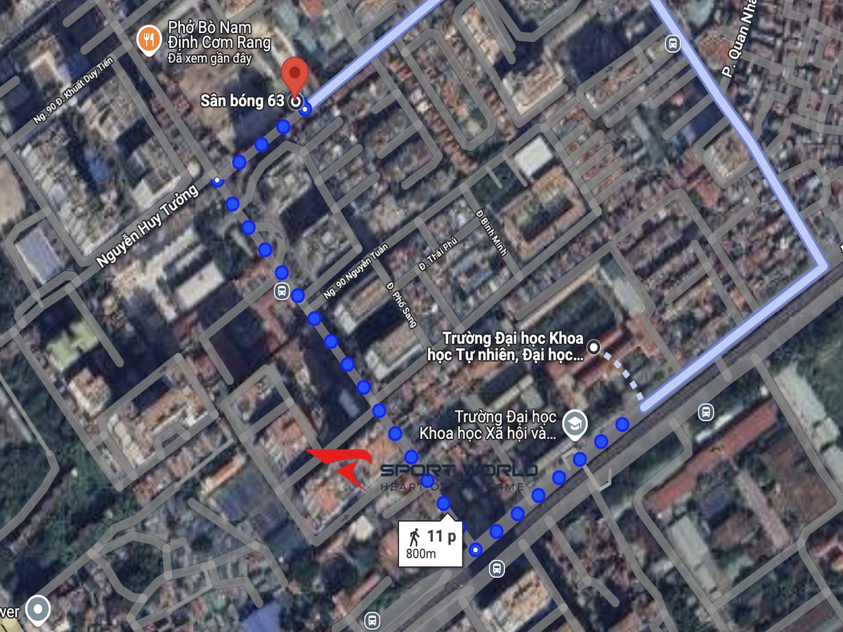 - Hướng dẫn đường đến Sân bóng 63: Đường đi đến sân bóng 63 : bắt đầu từ trường Đại Học Hà Nội đi về hướng Đông Nam 140m sau đó (rẽ phải) vào Hầm Chui Thanh Xuân/Đ.Nguyễn Trãi/QL6, 70m vòng ngược lại đi thẳng 900m rẽ trái vài Đ.Khuất Duy Tiến, sau đó 450m rẽ phải vào Nguyễn Huy Tường, đi tiếp 450m re phải vào Đ.Nguyễn Tuân, sau đó 10m rẽ trái sau bún Phở cơm rang Dưa bò-Good Eat Night (ở bên trái) đi thẳng 120m rẽ tráu sau đó đi thẳng 10m tới sân bóng 63.