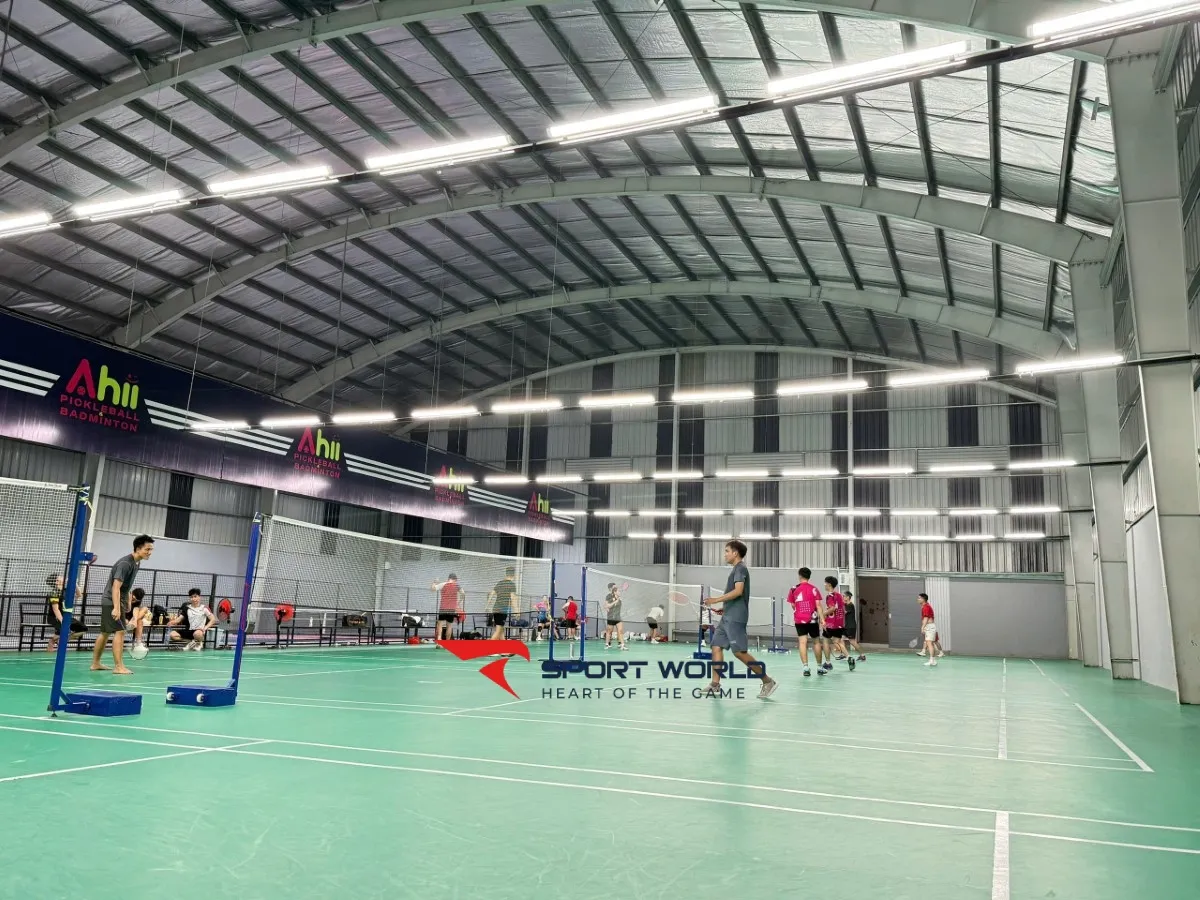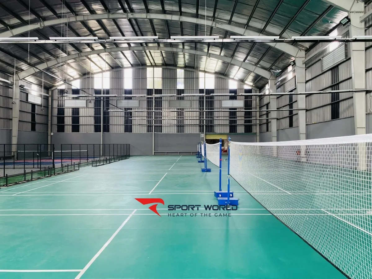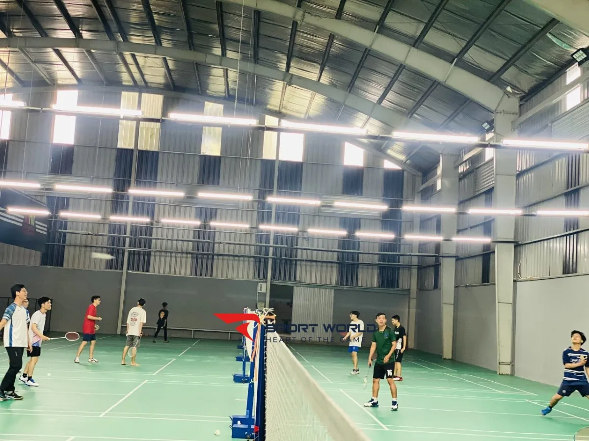 -  Kích thước mỗi sân: 13.4m x 5.18m – đúng theo quy định Liên đoàn Cầu lông Thế giới (BWF)