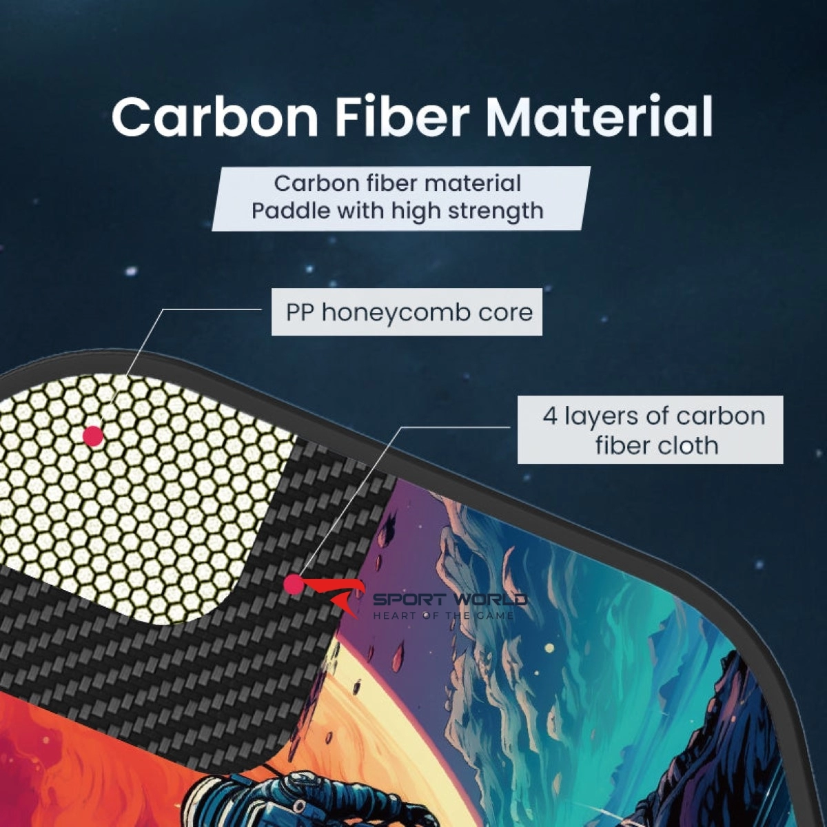 - PP Honeycomb: Lõi tổ ong bằng polypropylen cải tiến phối hợp liền mạch với mặt sợi carbon, hấp thụ rung động để mở rộng điểm ngọt và cho cảm giác nhẹ nhàng hơn, mang lại sự cân bằng hoàn hảo giữa sức mạnh và độ chính xác.