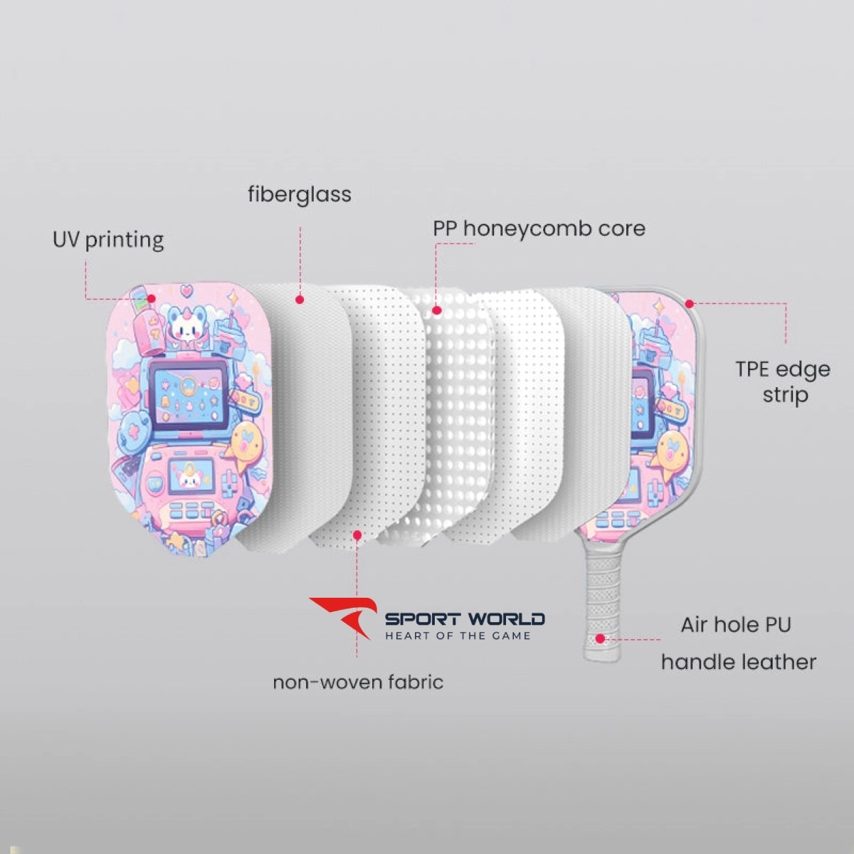 - PP Honeycomb Core: Giúp vợt nhẹ hơn, tăng cường độ cứng và độ bền, hấp thụ sốc tốt, đồng thời cải thiện độ linh hoạt và khả năng kiểm soát khi đánh.
