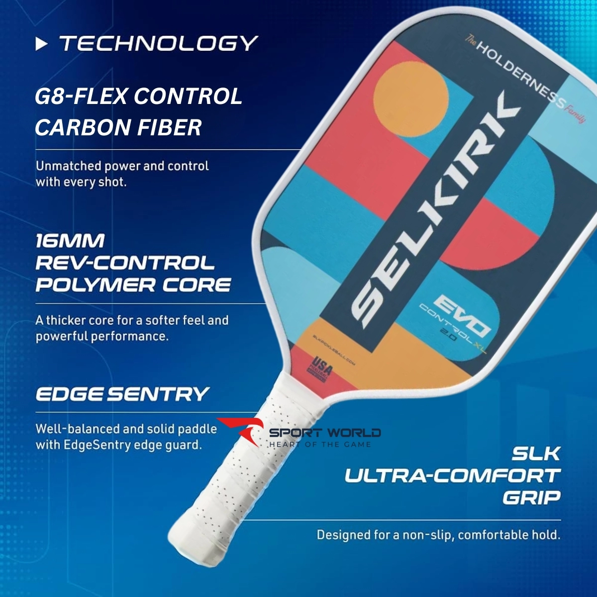 - Vợt Pickleball Selkirk x The Holderness Family Evo 2.0 - Control - XL hướng tới lối chơi phòng thủ và và kiểm soát toàn diện.
